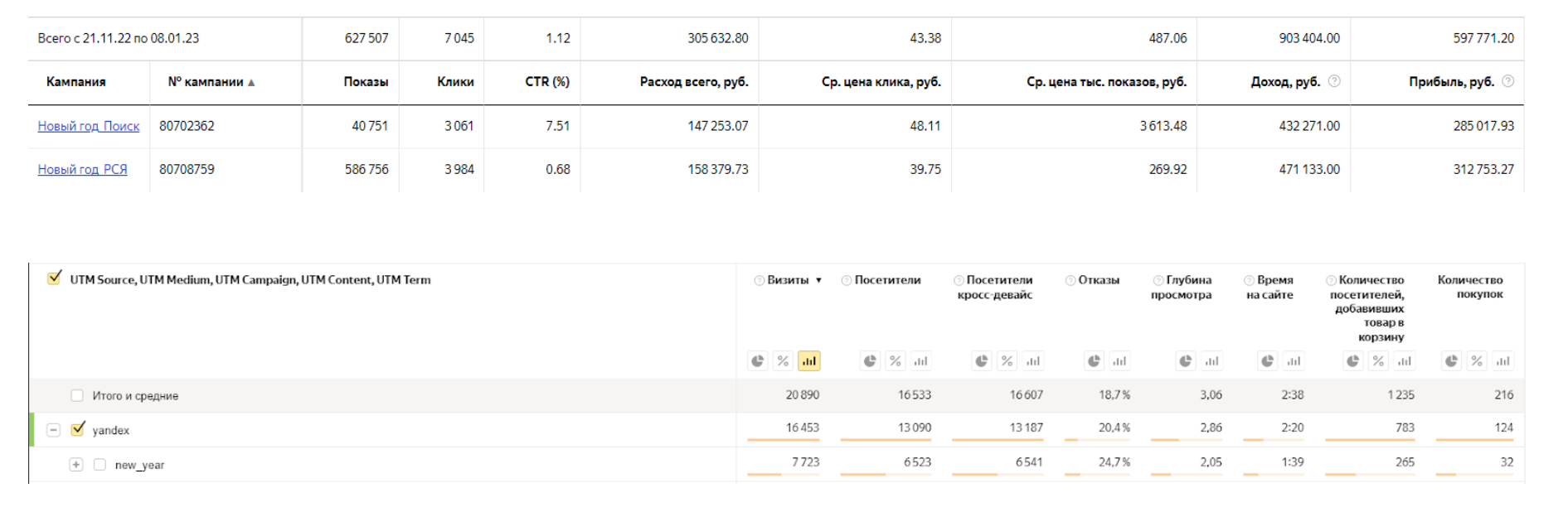 В течение всего времени открутки кампании мы регулярно отслеживали результаты с помощью Яндекс Директ и Яндекс Метрики. Так на сайте мы используем счётчик Я.Метрики, а также промечаем рекламные ссылки UTM-метками, это позволяет нам отслеживать результаты кампании в Метрике (визиты, % отказов, кол-во покупок, корзин итд).