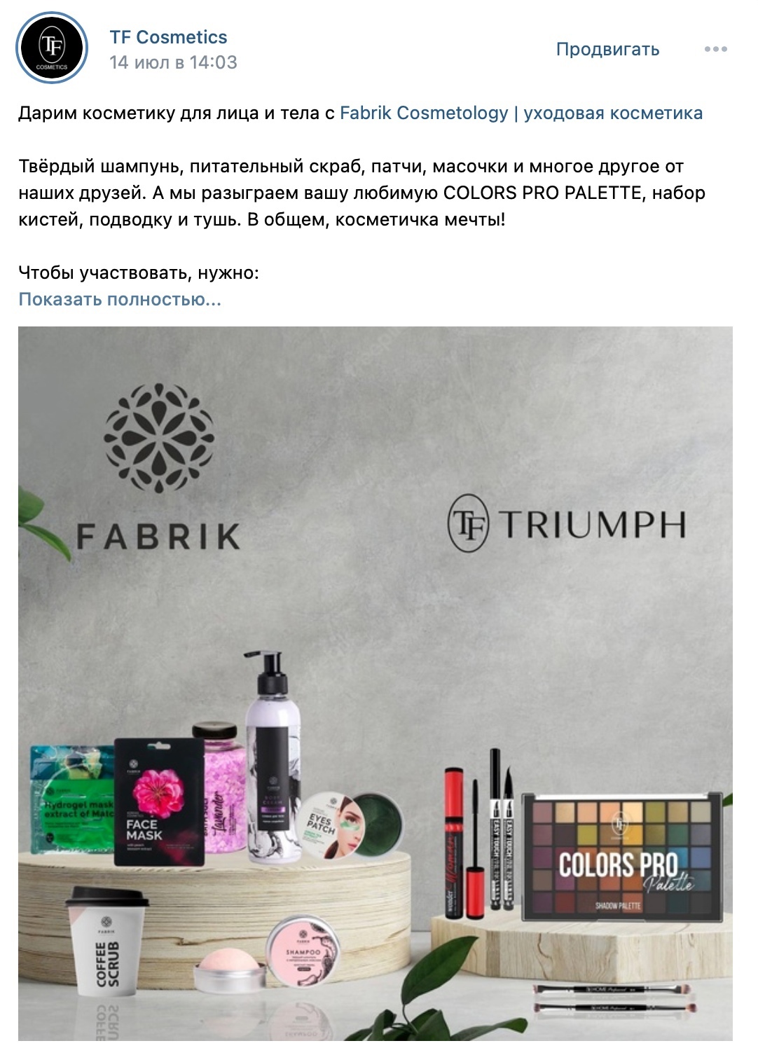 Ежемесячно мы проводили кросс-промо с простой механикой: лайк, репост и подписка. В качестве призов делали брендированные боксы с косметикой.