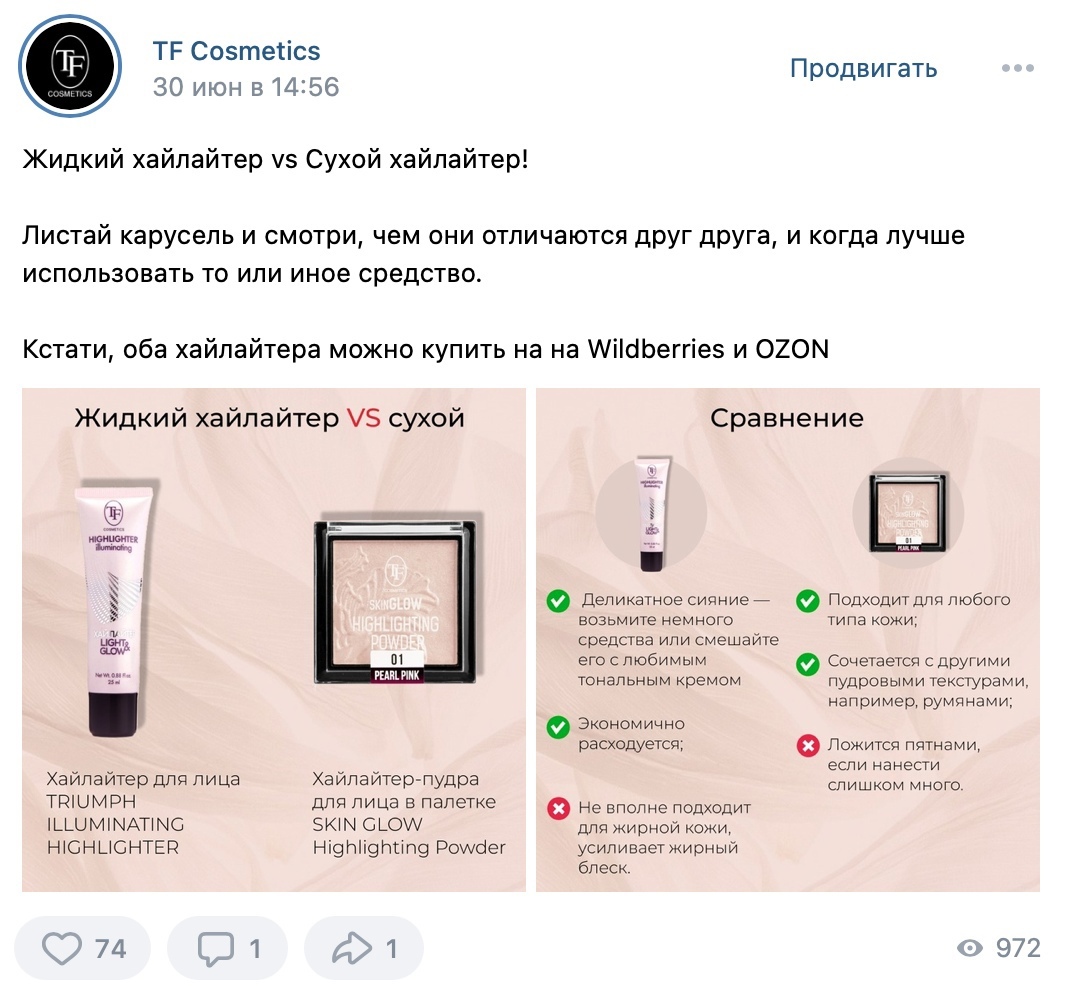добавили «вирусные» посты (подборки средств для макияжа, лайфхаки по макияжу, собери свою косметичку, образы под инфоповоды)