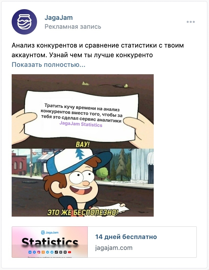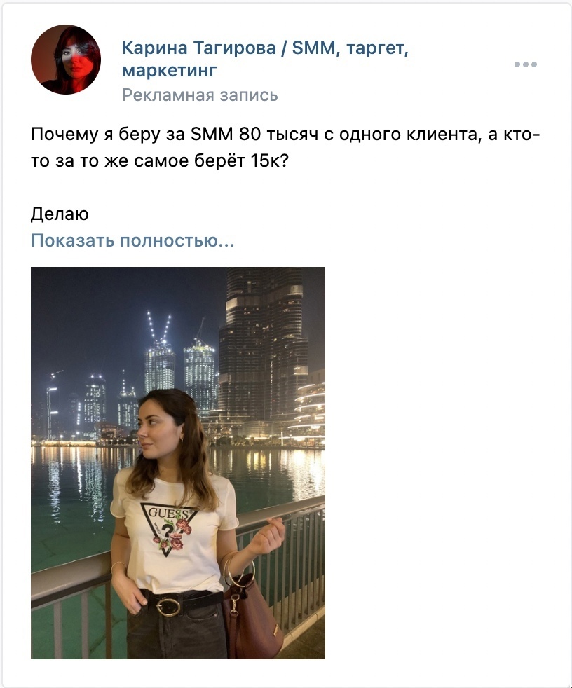 Мы несколько месяцев перебирали аудитории и форматы рекламы, пока первый хороший результат не получили с такого поста, запущенного от имени другого паблика:
