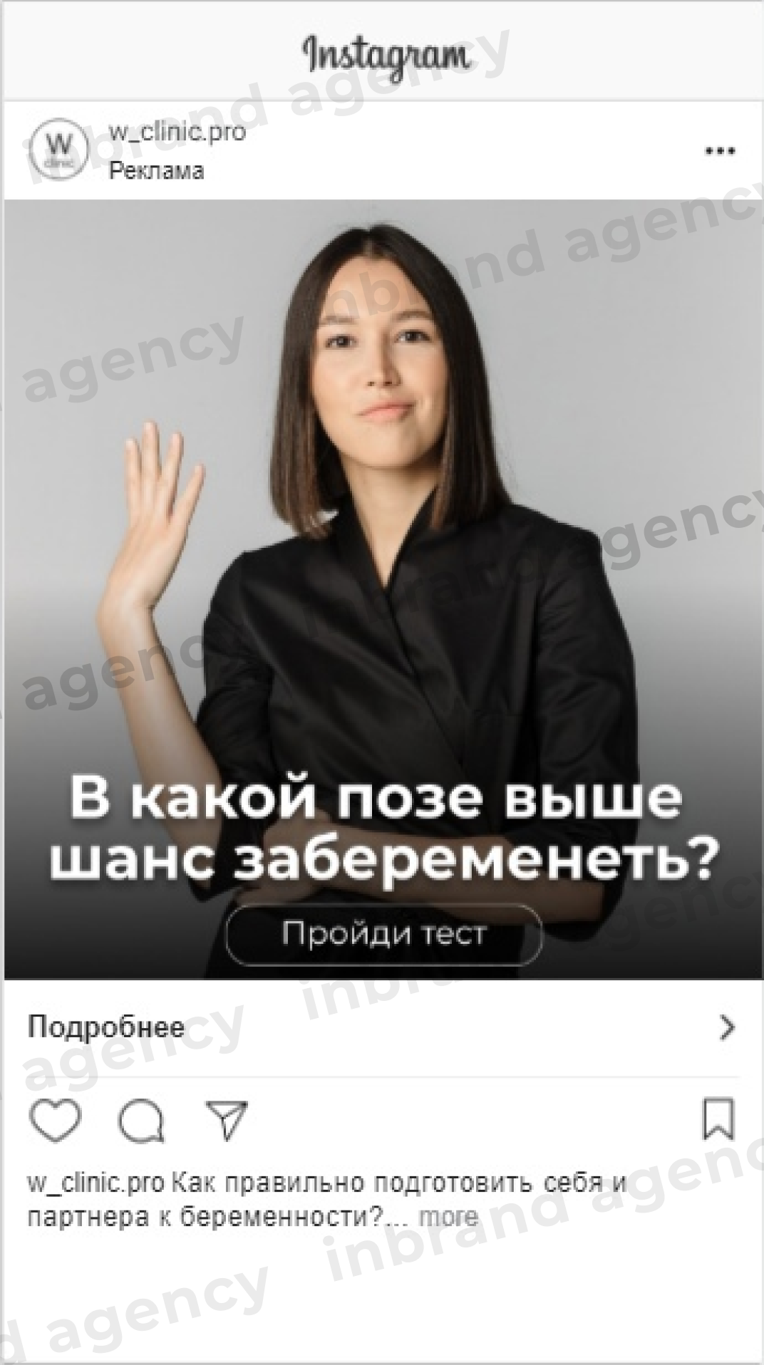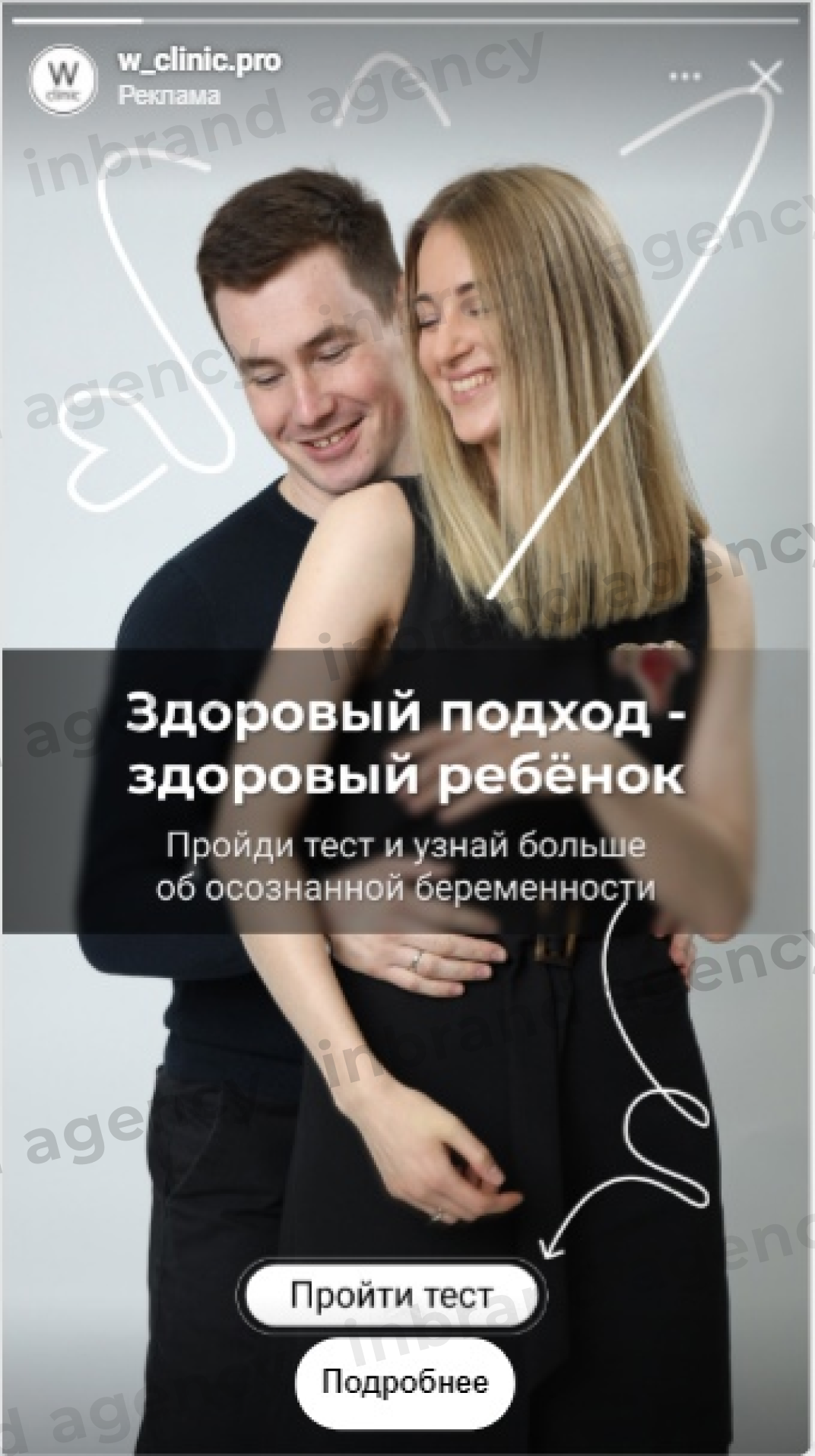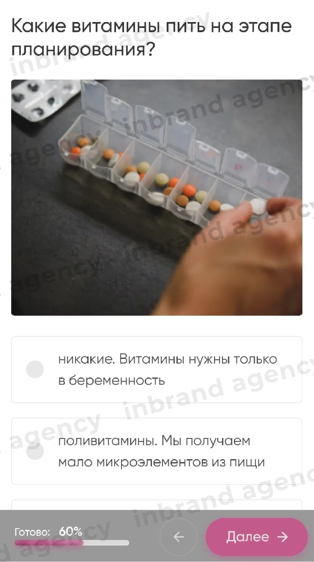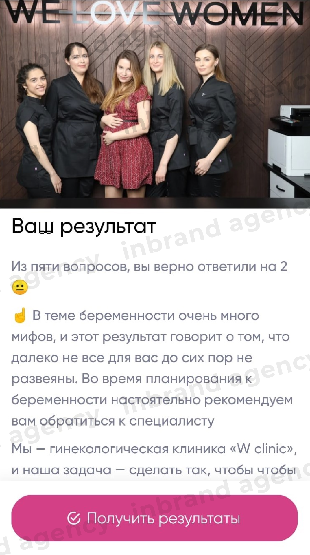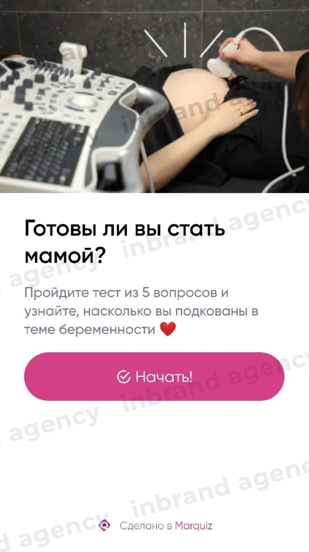 Вместе с врачами клиники мы разработали тест из 5 вопросов - популярных мифов и заблуждений в теме беременности, на который вела реклама из Instagram. Использовали сервис - Marquiz.