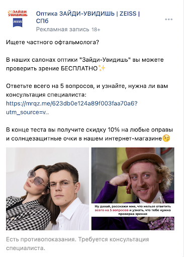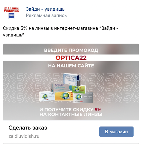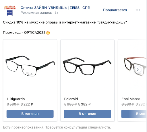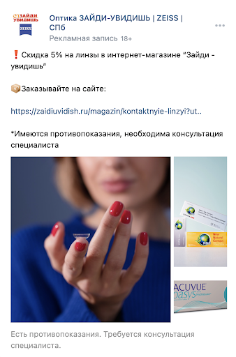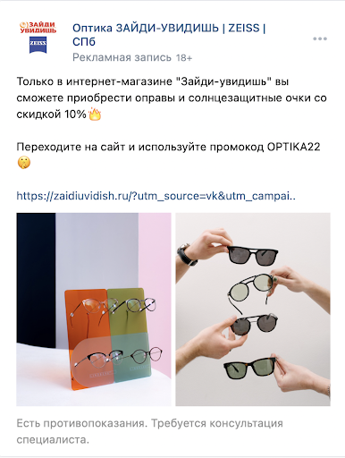 Для создания стабильного трафика аудитории для дальнейшей продажи оправ, линз и записи на диагностику были запущены рекламные кампании во ВКонтакте и Instagram (запрещенная на территории РФ социальная сеть. Кампании запускались в 2021 году).