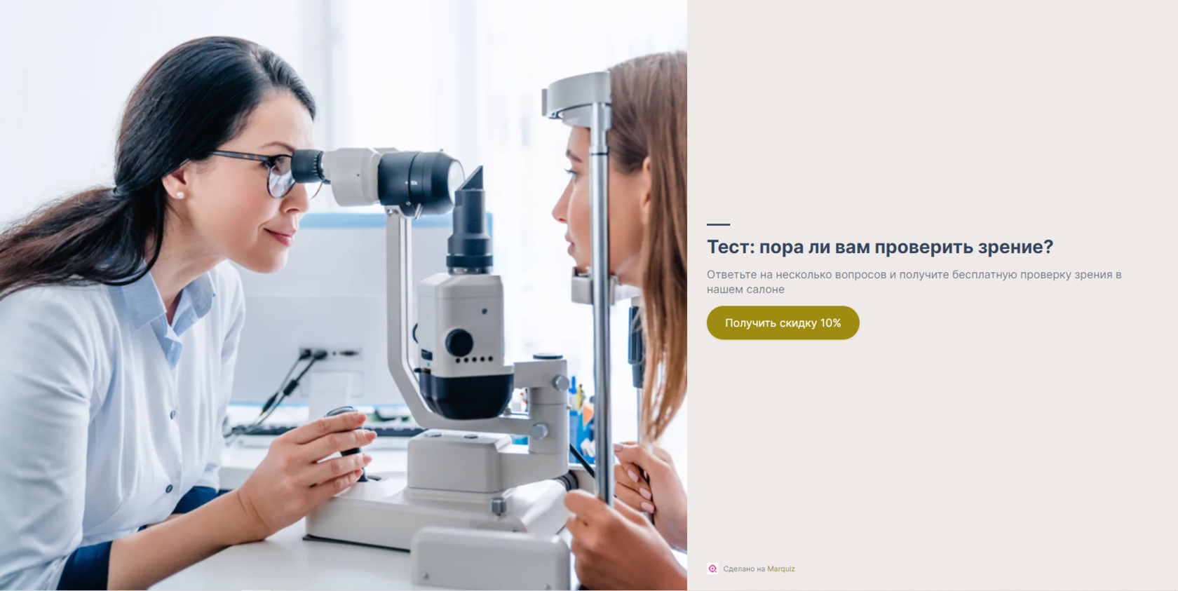 Для увеличения конверсии в покупку нами был разработан уникальный квиз. Пользователь мог подобрать оправу под свой тип лица, выбрать нужный материал очков и активировать скидку. Благодаря квизу увеличили CTR (средний показатель с 0,6% вырос до 0,8%).