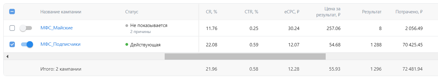 Сумма затрат: 70 425,45 руб. Количество кликов: 5 833 Количество привлеченных подписчиков: 1 288 Стоимость подписчика: 54,68 руб. Конверсия из клика в подписчика: 22,08%